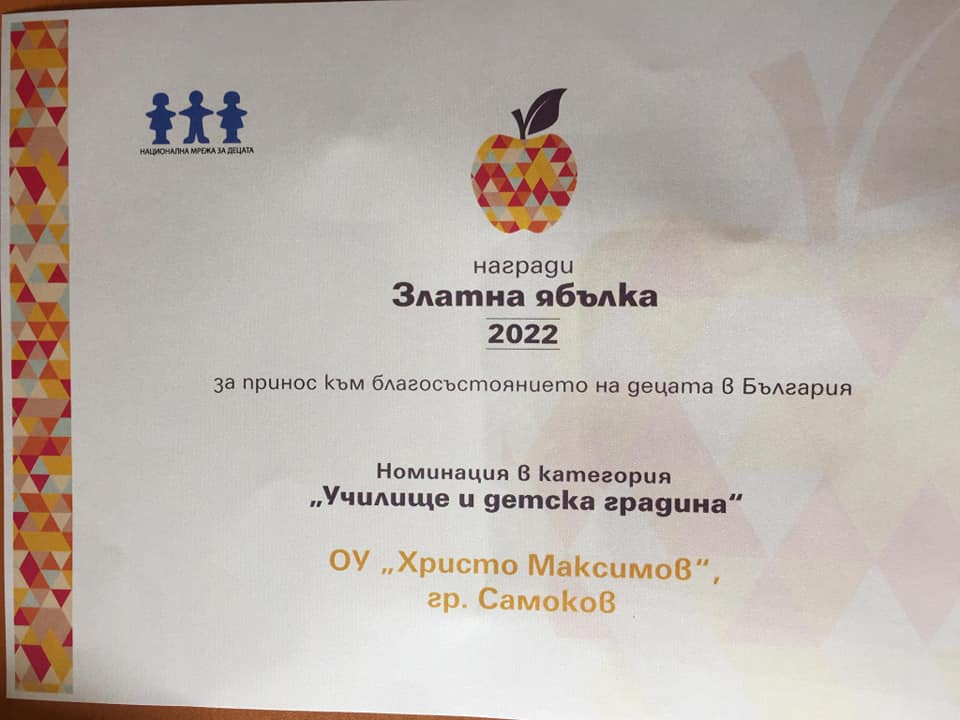 DetailsОтличие за г-жа Антоанета Николова и ОУ “Христо Максимов” Национална мрежа на децата, търсеща героите на децата в днешния ден– хора, които всеки ден помагат за разбирането, че те имат нужда от специално внимание и подкрепа награждава ОУ „Христо Максимов“ с директор Антоанета Николова за принос към благосъстоянието на децата в България. Номинациите се правят…