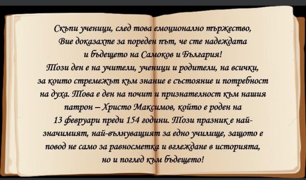 Поздрав от директора на ОУ “Христо Максимов” по повод патронния празник на училището: https://www.facebook.com/195430983816818/videos/428031788534569