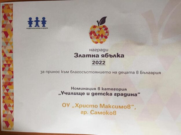 Отличие за г-жа Антоанета Николова и ОУ “Христо Максимов” Национална мрежа на децата, търсеща героите на децата в днешния ден– хора, които всеки ден помагат за разбирането, че те имат нужда от специално внимание и подкрепа награждава ОУ „Христо Максимов“ с директор Антоанета Николова за принос към благосъстоянието на децата в България. Номинациите се правят…