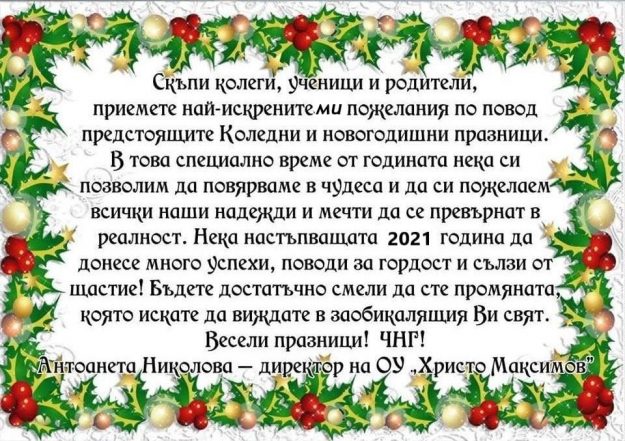 На вниманието на всички ученици и родители! Първият учебен срок ще продължи до 02.02.2021г. /вторник/. Сряда – 03.02 е междусрочна ваканция. Учебните занимания се възобновяват в четвъртък, 04.02, когато ще започне и вторият учебен срок. В присъствена форма на обучение ще продължат да се обучават учениците от начален етап /I – IV клас/, както и…