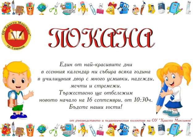 Един от най-красивите дни в есенния календар ни събира всяка година в училищния двор с много усмивки, надежди, мечти и стремежи. Тържествено ще отбележим новото начало на 16 септември, от 10:30ч. Бъдете наши гости!